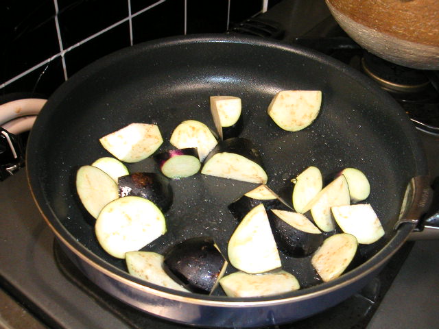 乱切りにしたナスを、サラダ油で炒めます。