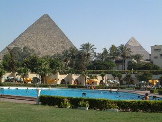 ピラミッド近辺には、いくつか最高級ホテルが並んでいる。写真だと遠近がよくわからないが、ここのプールからは迫り来るような巨大なピラミッドが見える。バーやレストランもピラミッドが目の前に見えるようにパノラマ窓にしてあるところが多く、一度泊まってみたいところ。