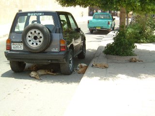 シタデル(ムハンマドアリモスクなどがある、カイロ市東側丘中腹の城砦)で見かけた犬の親子。車の日陰に、ほとんど死体かと思うような姿で転がっていた。猫も犬も多い街だが、特に犬は、毛並みばさばさでやせ細りながらゴミをあさり、同情をそそるみじめな格好のものが多い。