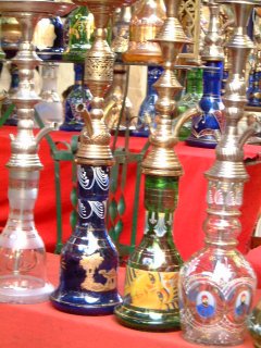 土産物やで売られているシーシャ(水ギセル)。持って帰りたいのはやまやまだが、壊れそうで躊躇。