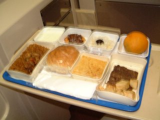 機内食と同じようなものがでる。レーズンとマカデミアナッツが入った炒めご飯が微妙な味でおいしかった。