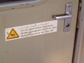 電車がとまるまでは開けないように、との注意書き。確かに電車が走り出しても、プラットフォームのシャイ売りの少年が飛び乗ったり、飛び降りたい、と日本の電車とはちょっと違うようだ。(電車もプラットフォームを過ぎるまでは、相当ゆっくり走る)