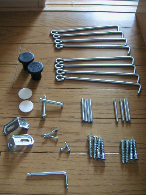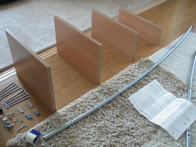 | 箱を開けて中身を取り出す。 棚板は、うまい具合に立ってくれた。 よし、このまま組立だ! 忘れてはいけないのが、ねじ本数の確認。 左右両側用にセットにしておくと、後で混乱しないですむ。 |