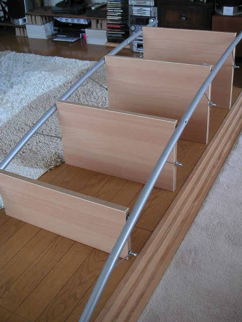 吊り下げる金具をポールに取り付けて、棚に固定してゆく。全部つけおわるまでは、きっちり締め付けず、「仮止め」にしておこう。(重要です) |
