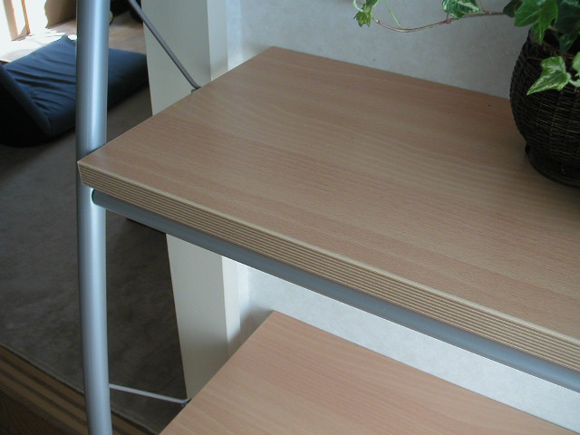 | やさしい木の色と、やや黒味がかったパイプの色があいます。足も2本だけ。でも棚板4枚を壁にぺったりとくっつけたら、不思議なくらい安定してしまうのです。 なかなかミラクル。 |