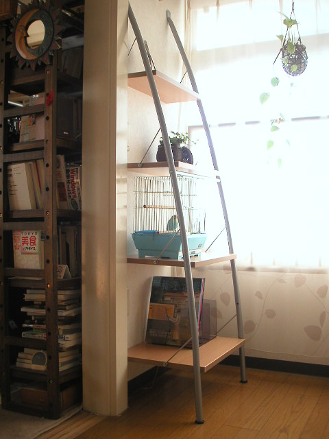 | ひとつ家具が増えたものの、少しも圧迫感はなく、狭くなった気もしないのが嬉しい。 もし全く同じ素材でも、4本のポールでまっすぐ立っているシェルフだったら、違っていたことだろう。 |