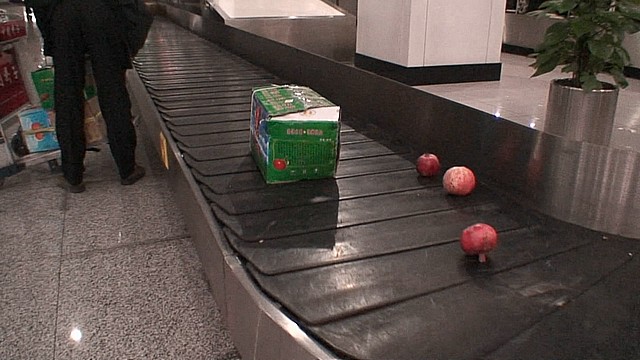 理由はよくわからないんだけど、果物を箱いっぱいにつめて預けていた人が多く、その段ボールがかなりへたっているのと、荷物扱いが荒かったらしく、あっちでもこっちでも、ざくろや柿などがぽろぽろこぼれていて、荷物の主が慌ててベルトコンベアの上に散らばった果物をかき集めている風景があった。