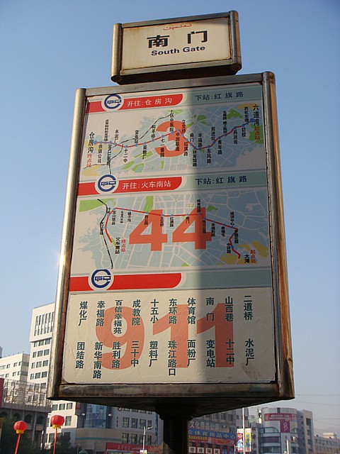 あと、これは昨年、天津をまわっていた時にも思ったんだけど、バスがまた非常に乗りやすい。バス停にこんな感じで路線図なり、バス停名を並べて書いたものがあるので、こちらも地図と照らし合わせれば、自分が何番のバスに乗ればいいのか一発でわかる。