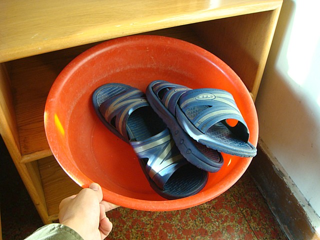 (前のホテルから使い捨ての室内スリッパを持ってきておいてよかった)