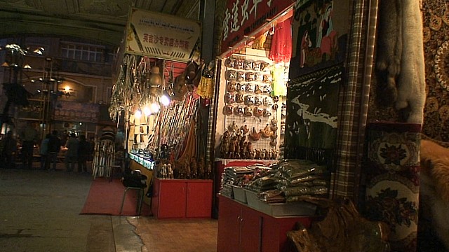 ウイグル族の伝統衣装や刀、香辛料などを並べたお店がたくさんあった。