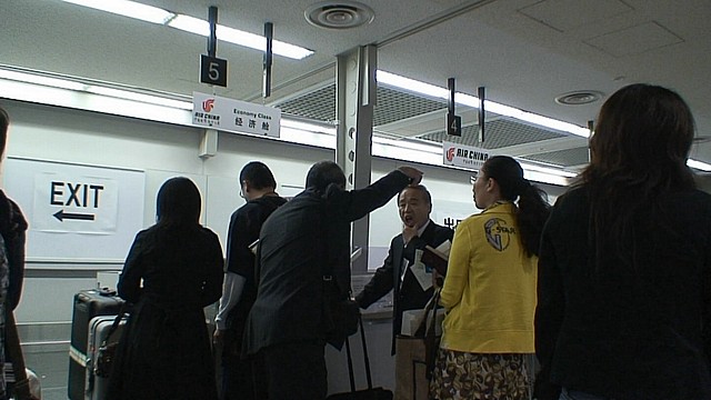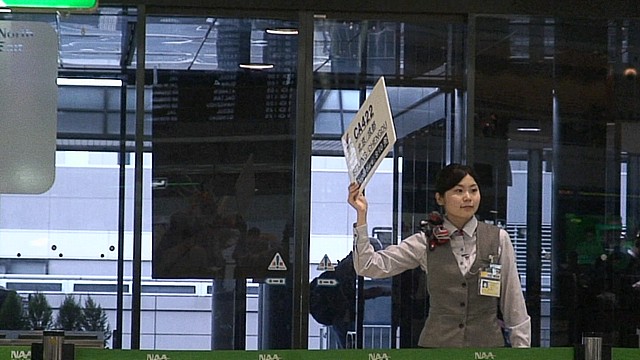 女性スタッフが、便名を書いた紙で誘導しているのだが、矢印の向き先がどうみても「空港の外」。