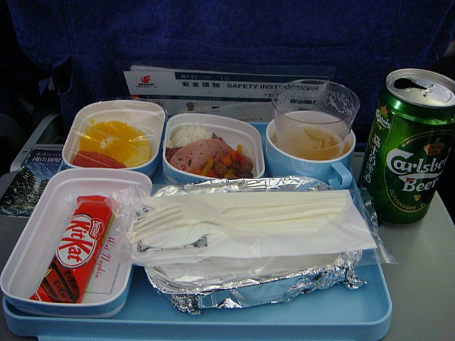 機内食をデジカメで撮っていたら、一番窓側に座っていた人がそれを見たらしく、まん中の人に聞いていた。