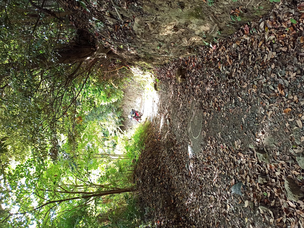 住宅街を抜け、道が2本に分岐する場所があり、そのうち左側の登坂を進むと古道っぽいところにでます。特に自転車・バイク進入禁止などの看板はありませんが、入り口近くは路面も凸凹ですのでバイクでは入らないほうが安全でしょう。