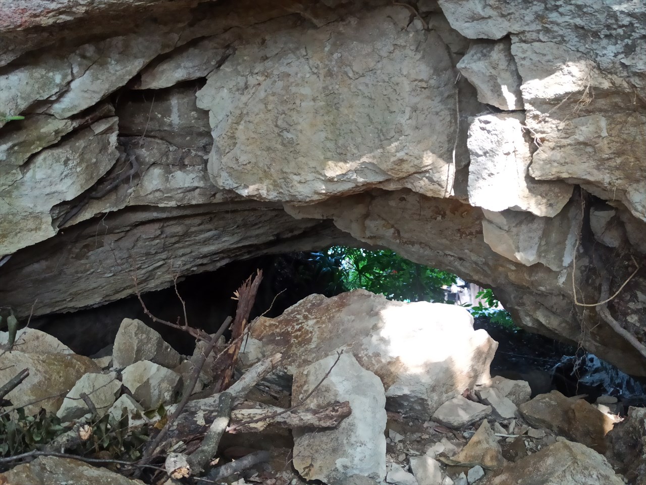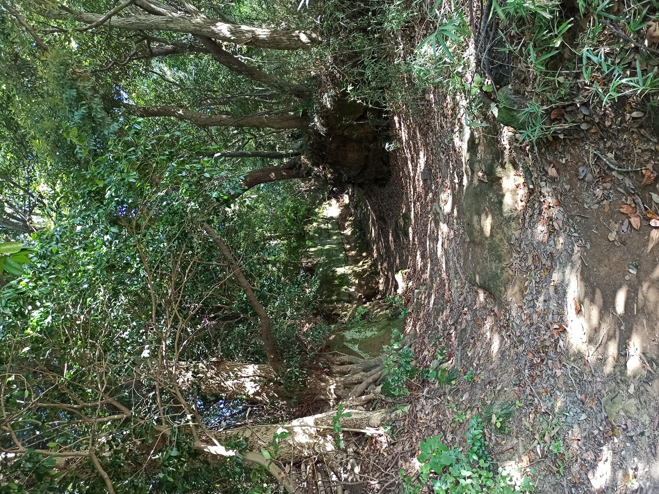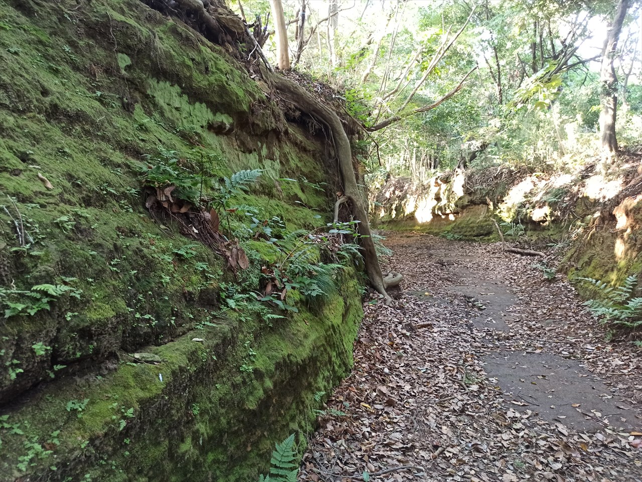 密に葉を茂らせた樹々の間から漏れる光がまだらに地面や切り立った崖面に落ちて、なんだか幻想的な風景になっています。