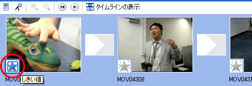 タイムライン表示の場合は、その効果を適用したクリップの上に、このように★マークがつきます。