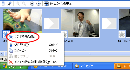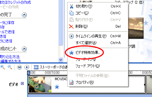 ストーリーボード表示の場合、クリップ上で左クリックするとメニューウィンドウが開きます。その中の「ビデオ特殊効果…」を選択してください。