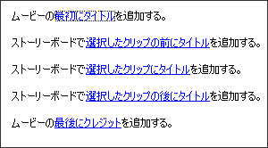 動画の上に文字をのせるには、「ストーリーボードで選択したクリップにタイトルを追加する」を選択します。