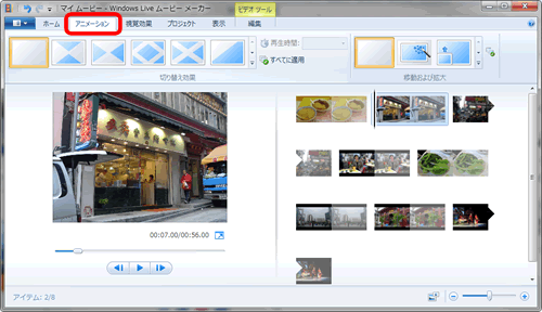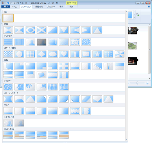 「切替効果」「移動&拡大」を設定するには、「アニメーション」タブをクリックしてメニューを開きます。左側に「切替効果」、右側に「移動および拡大」のパターンが並んでいます。