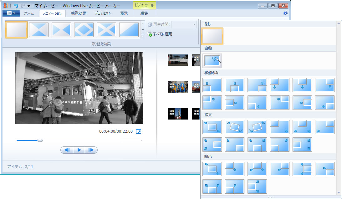動画クリップと動画クリップの間、シーンが変わる切替地点に様々な効果を入れることができます。写真を何枚も並べてスライドショー的なムービーを作る際にもスタイリッシュな作品になります。また静止状態の写真を表示している間に横方向に少し動かしたり、拡大したりして「動画ちっく」にすることも可能です。