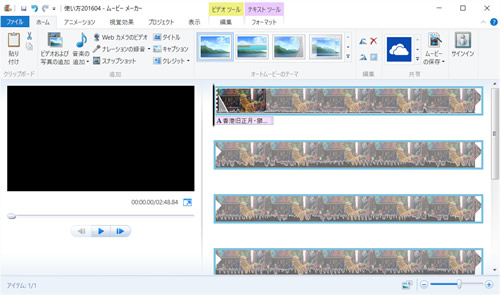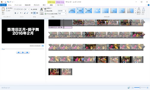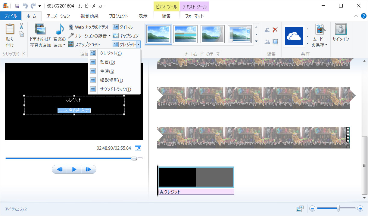 ムービーメーカーには、タイトルとクレジットを挿入する機能もあります。クレジットは動画の最後に、制作者や出演者の名前や撮影場所を入れたりするもので、個人の動画ではそれほど利用頻度は高くないかもしれませんが、タイトルは入れる人も多いでしょう。