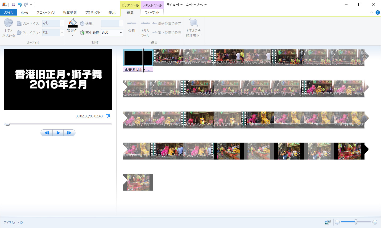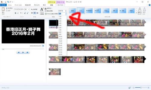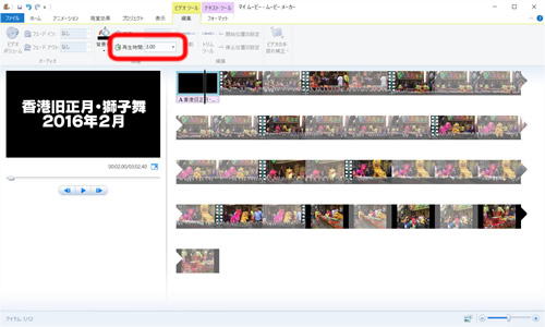 実はタイトルクリップ自体の長さを変更するのは、隣のタブ「ビデオツール」「編集」の中の「再生時間」なのです。こちらも3秒に変更しました。