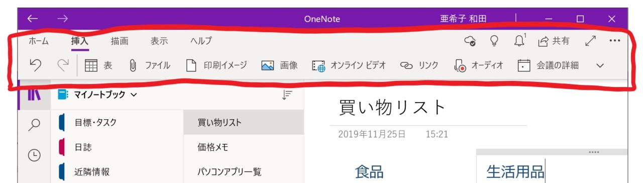 まずこの一冊のノートが「ノートブック」です。特別な使い方をするのでなければ、まずはこの一冊の中にすべての情報を書き込んでいきましょう。一番最初の段階では、Microsoftアカウントの名前が入った「○○さんのノートブック」が自動的に作られます。