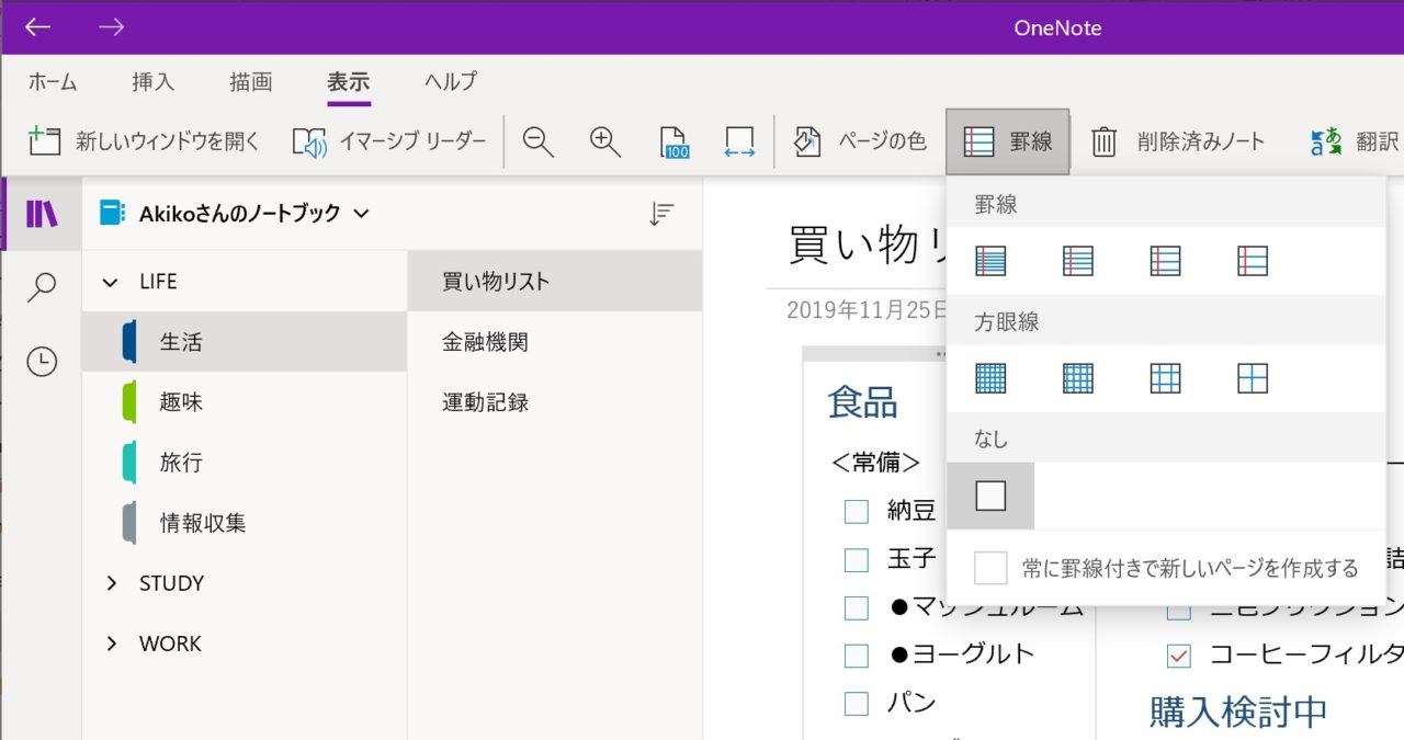 OneNoteの上部メニューバーの右から二番目に「表示」と書かれたメニューがあるのでクリックしてみてください。