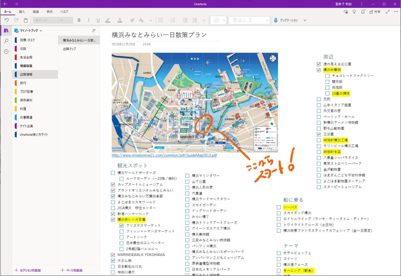 OneNoteでは、ブックの本文は横幅も高さも制限がありません。横方向にいくつものコンテナを並べて文字入力し、「段組み」的なレイアウトにすることもできますし、中央に写真や図などを配置し、その周囲にテキストや手描きで説明を書き加えていくこともできます。