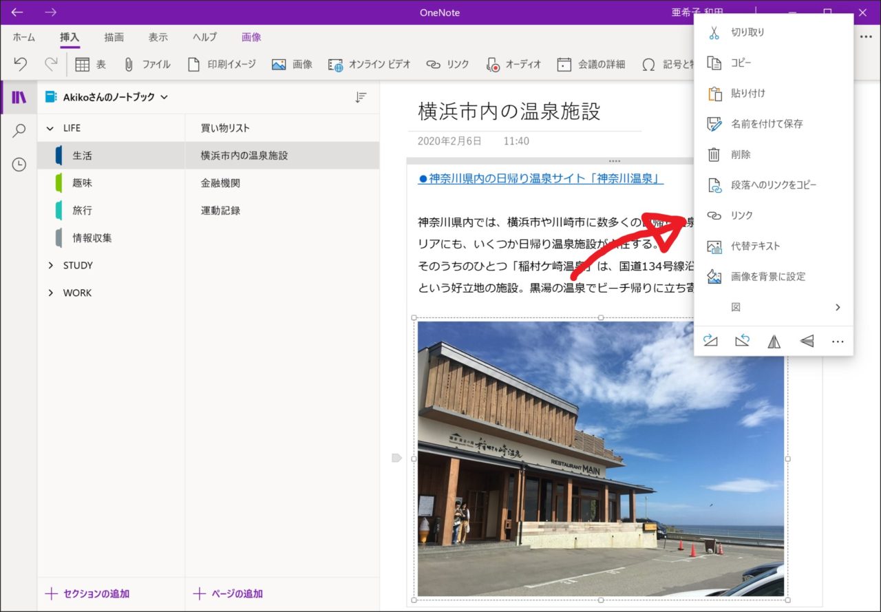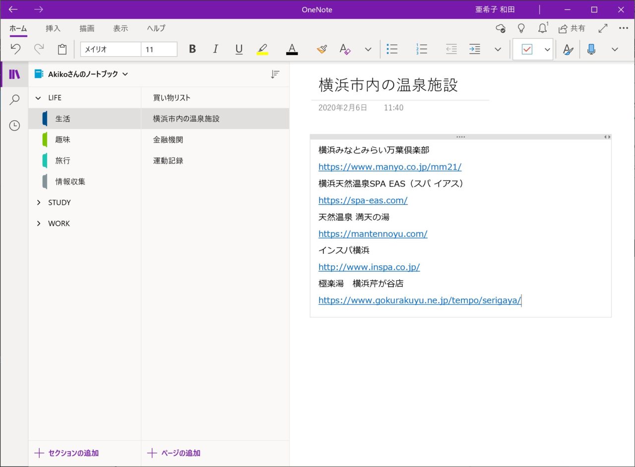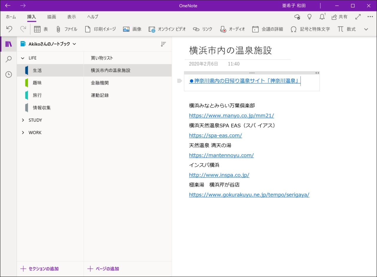 「http://」や「https://」で始まるURLを書き込んだり、コピー&ペーストすると、自動的にそのURLからリンクが張られ、URLの部分のテキストは青色で下線がついた状態となります。そこをクリックすると、ウェブサイトが開きます(ウェブサイトが開かないなという場合には、OneNoteアプリのサイズを縮小すると、その裏でブラウザが開いている可能性があります)。