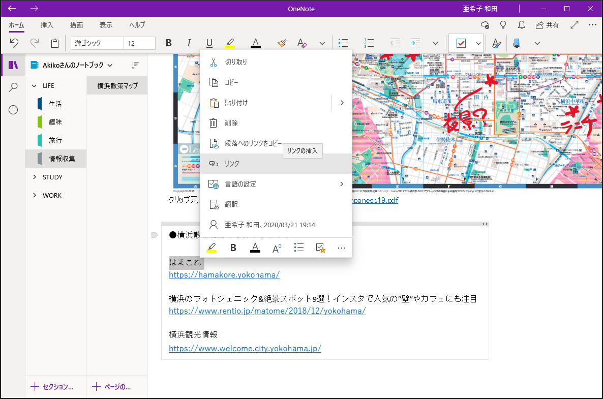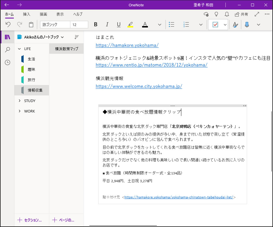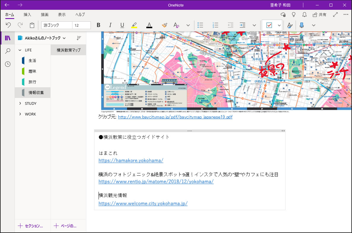 ブックマークでもいいのですが、OneNoteの散策ノートにまとめておけば、必要な時にさっと見つけ出すことができます。
