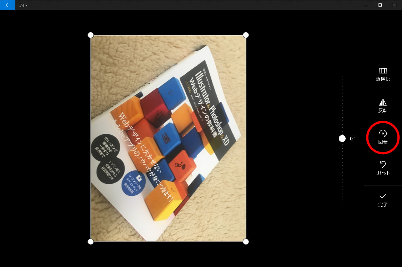 一回「回転」をクリックするごとに、時計回り方向に90度ずつ回転します。4回クリックすれば元の位置に戻ります。
