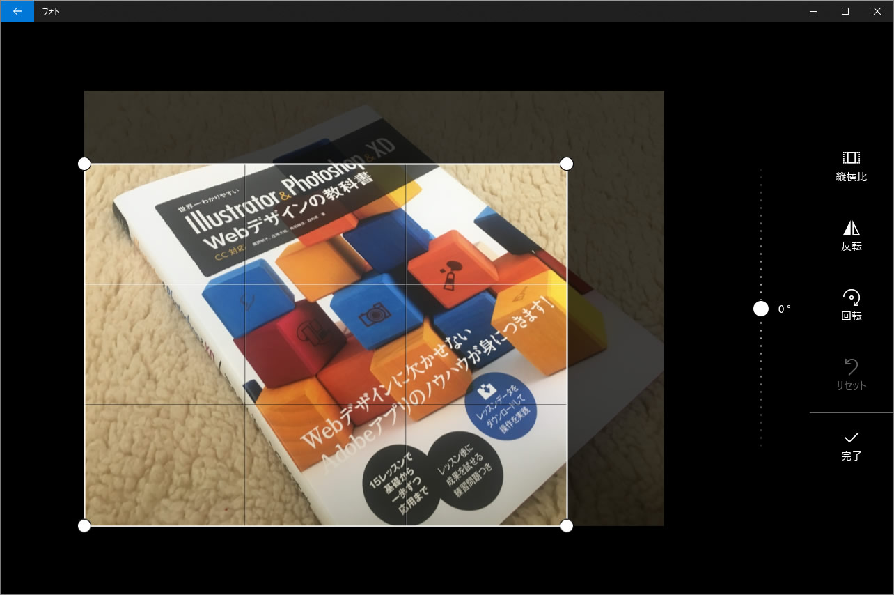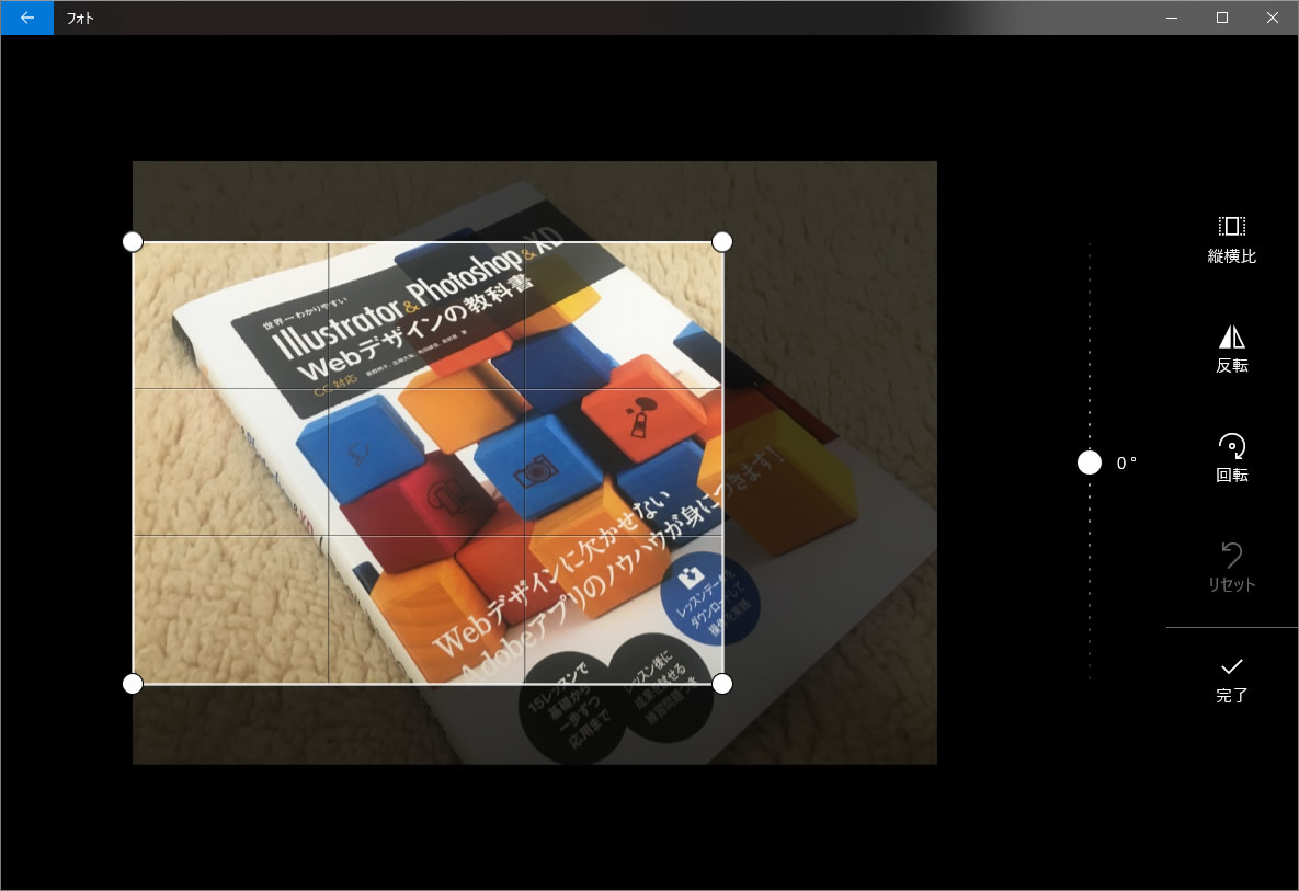 同じ縦横比でのトリミング(不要な部分をカットする)はもちろん、「縦横比」の「カスタム」を使えば、自由に好きな縦横比の写真にトリミングできます。