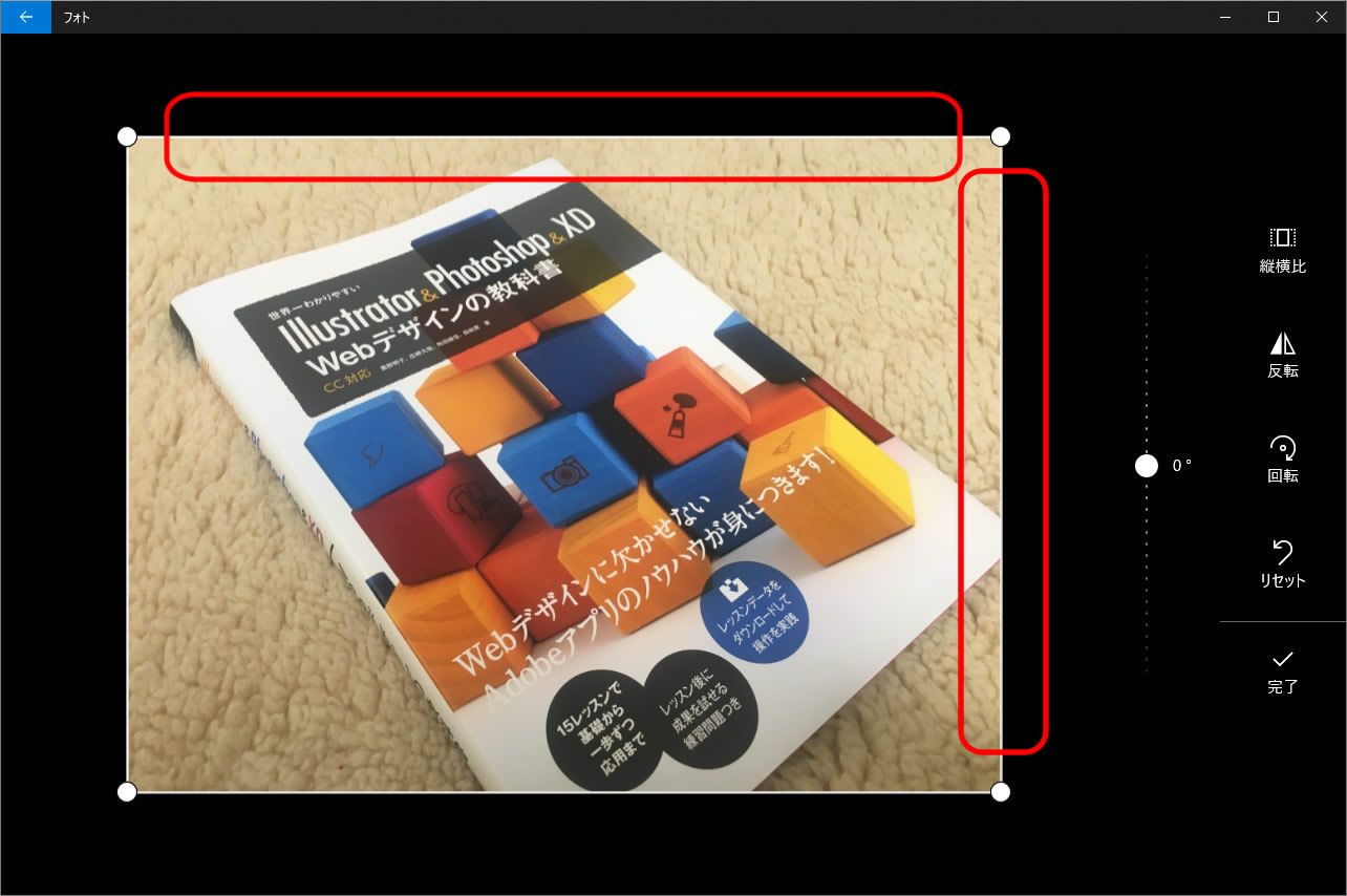 また複数の角からトリミングすることもできます。例えば右上から上部・右側をトリミングした後、左下から下部・左側をトリミングするなどです。
