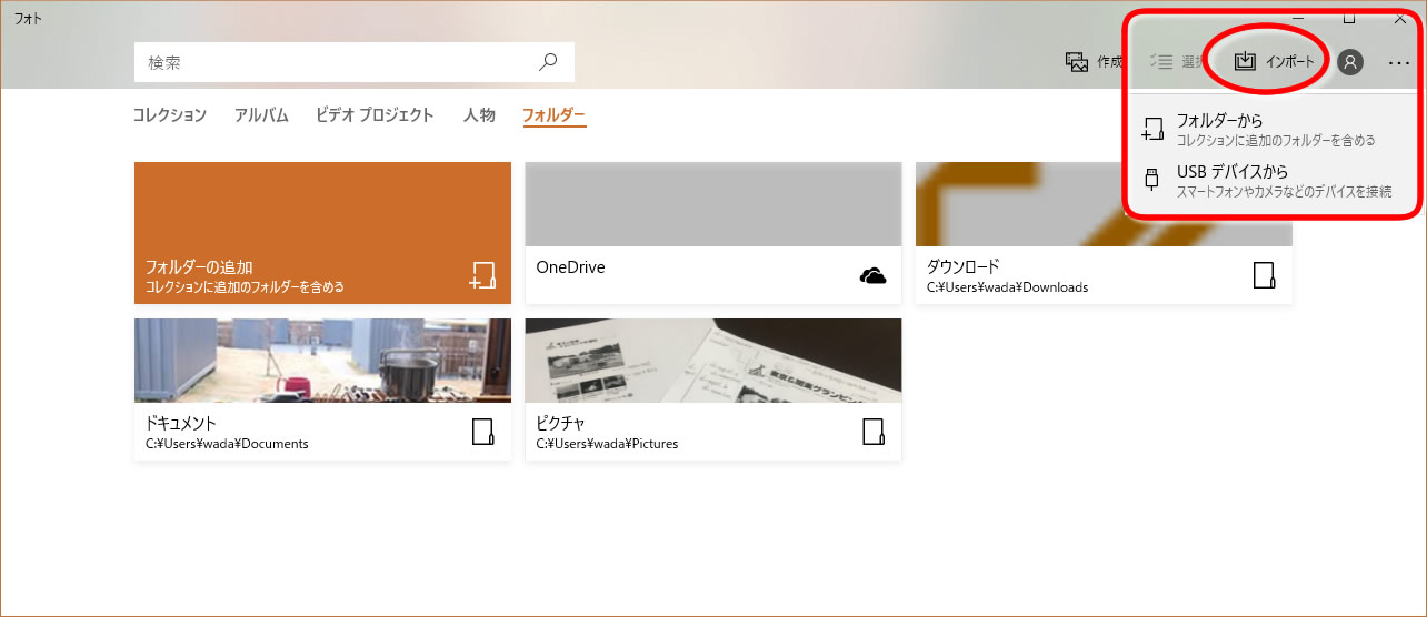 右上の「インポート」の「フォルダから(コレクションに追加のフォルダーを含める)」でも同様にフォルダの指定ができます。