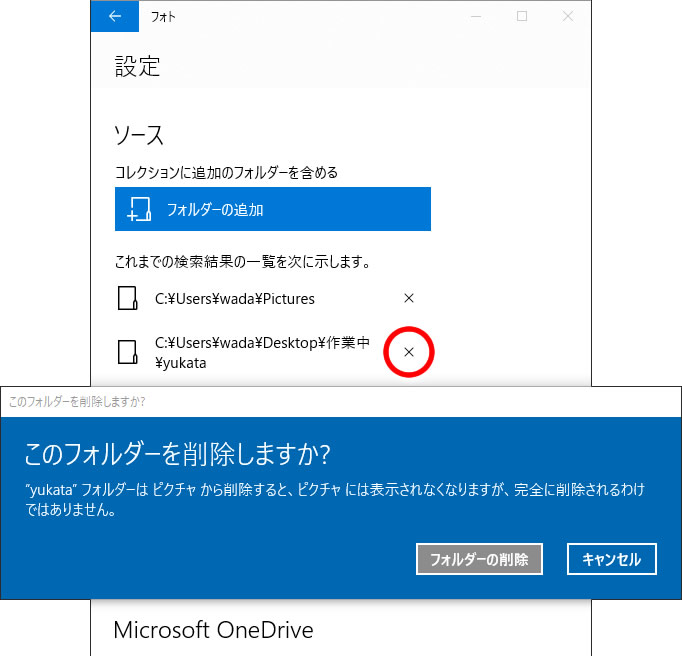 「このフォルダを削除しますか?」という確認ウィンドウがポップアップします。「フォルダの削除」とありますが、これはWindowsの「ライブラリ」の「ピクチャ」にそのフォルダ内の写真が表示されなくなって、「フォト」上にも写真が読み込まれなくなるだけで、フォルダ自体が削除されるわけではありません。