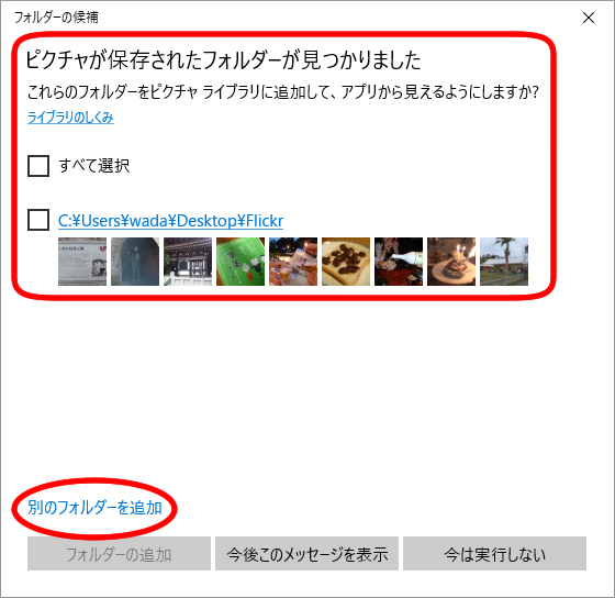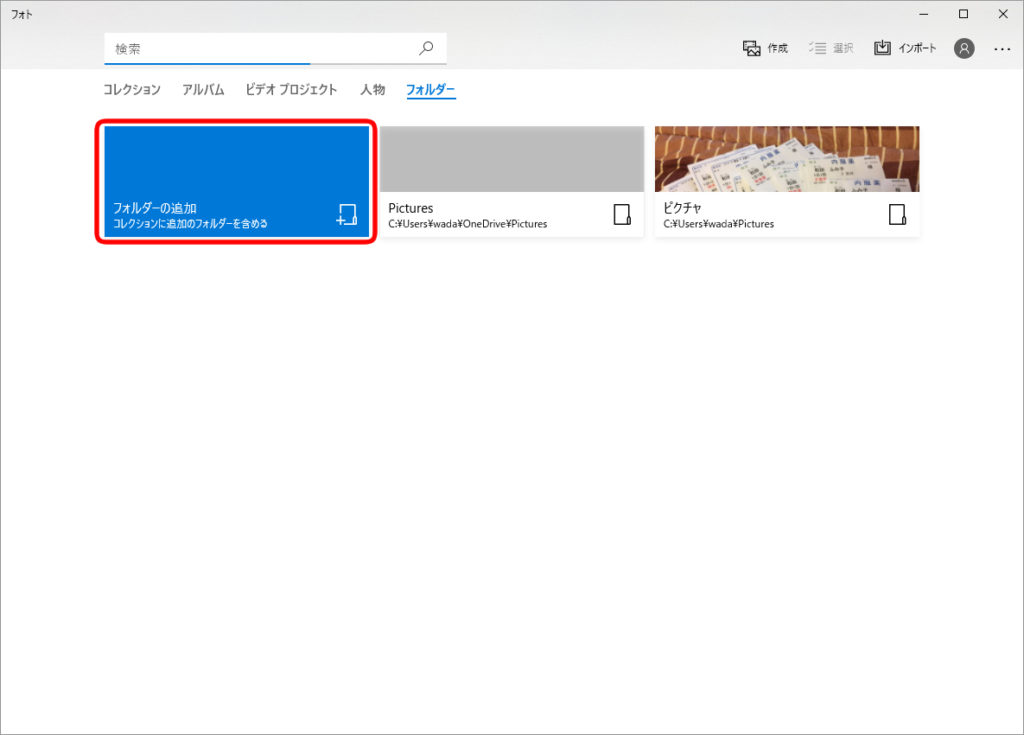 ここに登場している「ピクチャ」など以外のフォルダにも写真を保存している場合は、左端の青い「フォルダの追加」をクリックして追加したいフォルダを指定します。次にこの画面を開くと、フォルダがもうひとつ増えているはずです。