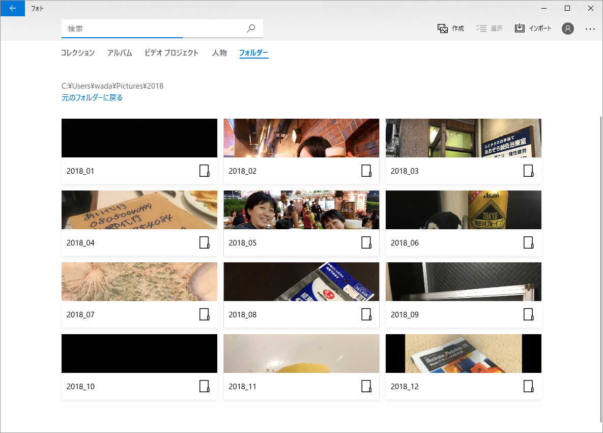 ちなみにフォルダでは、フォルダごとに写真を見ることができます。エクスプローラーで見るのとそれほど大きな違いはありませんが、表示方法などが違いますので一度覗いてみてください。