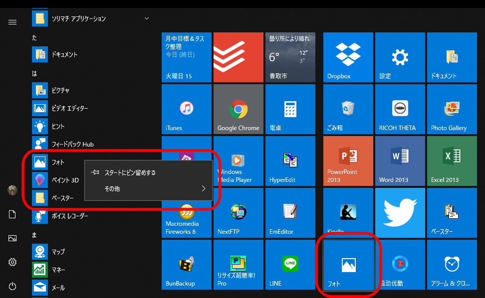 頻繁に使うようであれば、スタートメニューの「フォト」アイコンを右クリックし、「スタートにピン留めする」をしておきましょう。そうすれば、スタートメニュー右側のコーナーにタイル状の「フォト」アイコンが追加され、次回から起動にかかる時間が短縮されます。