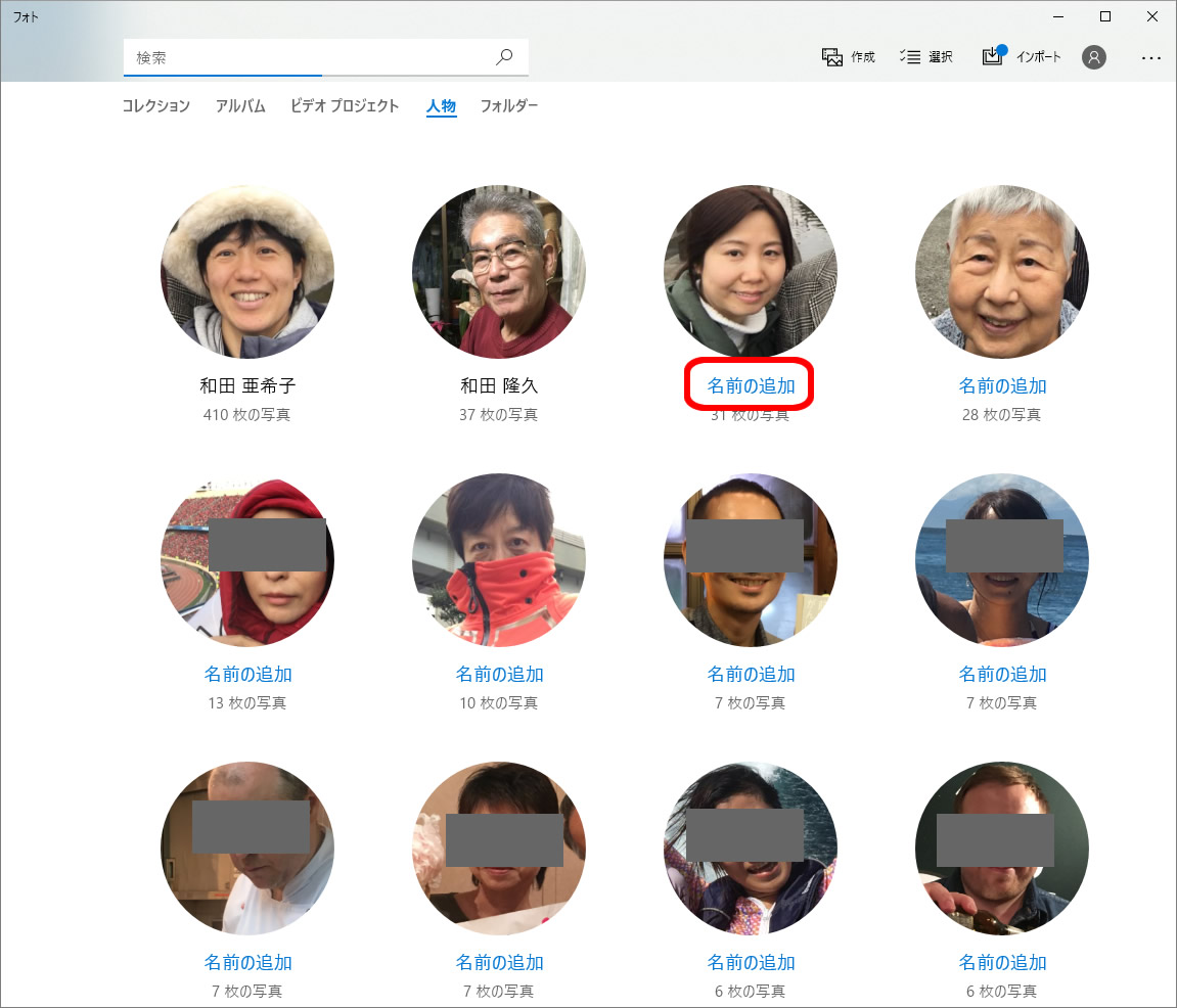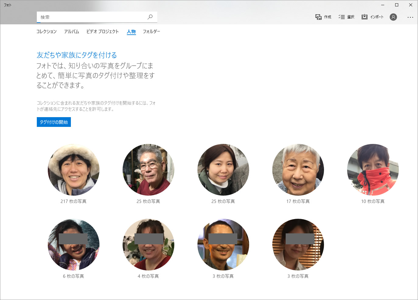 これ、「フォト」の顔認識機能によって自動的にチョイス・タグ付けされたものなのです。Googleフォトなどではお馴染みの便利な機能なのですが、「クラウドに写真を保管するのは抵抗がある」という方もいるでしょう。Windowsの「フォト」でも、ある程度同じことができます。