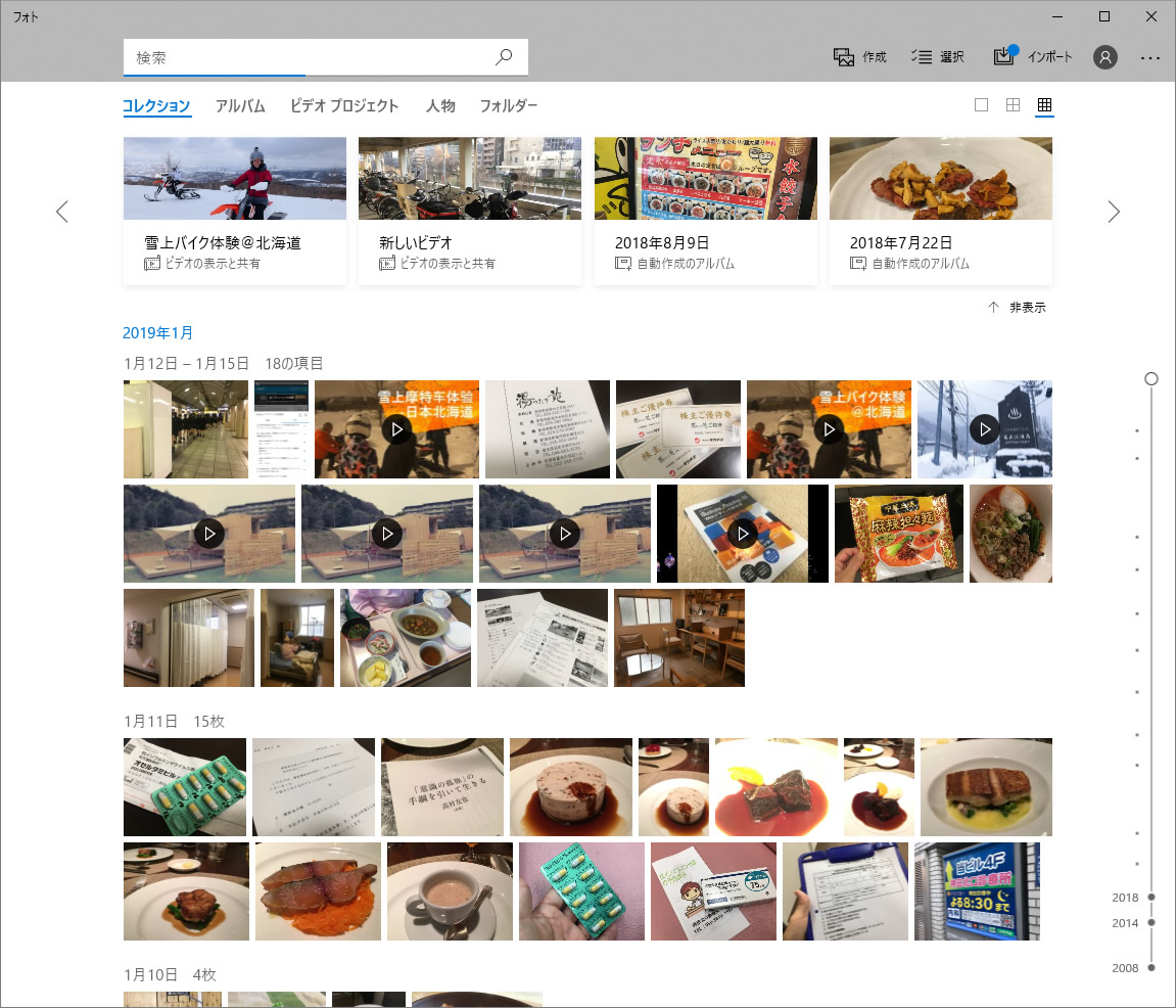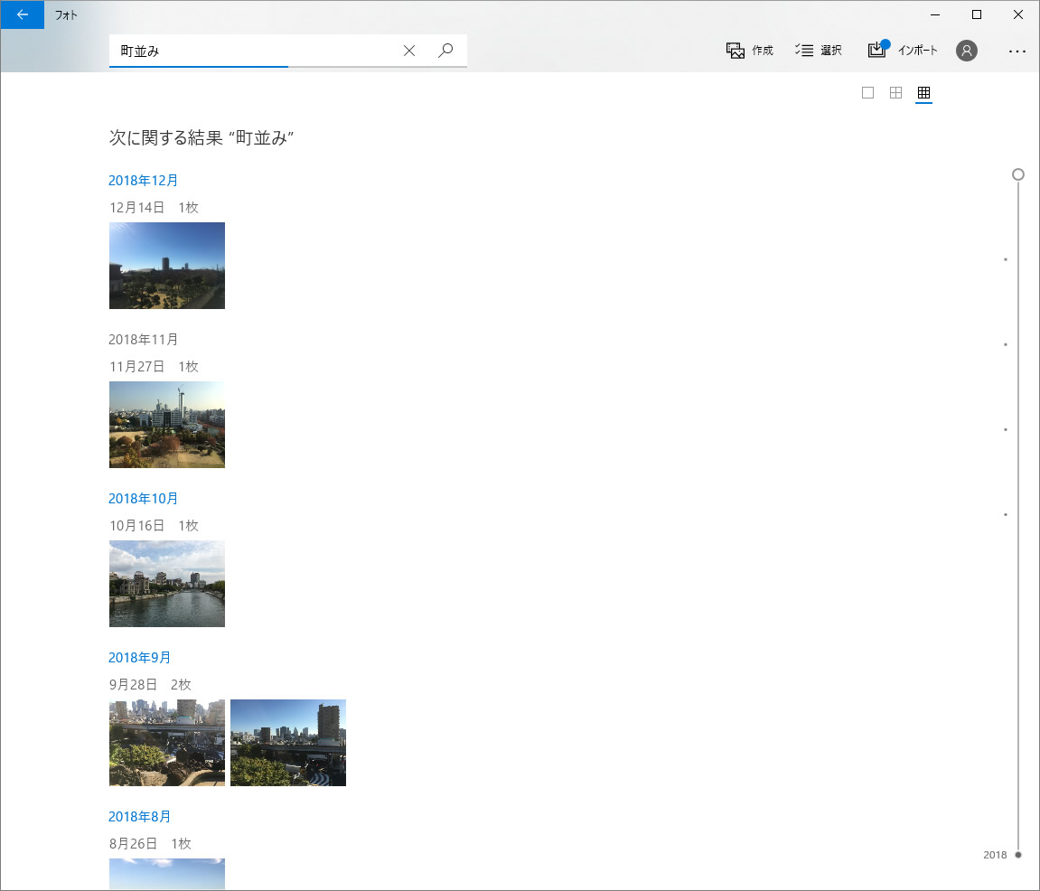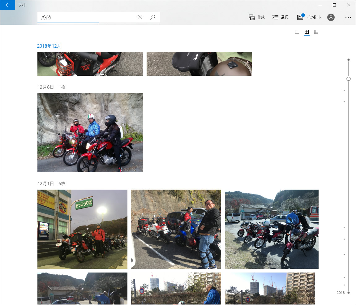 「フォト」が便利なのは、写真を保存してあるフォルダが異なっていても、ここでは日付別にすべてを閲覧することができる点です。たとえば私の場合、デジカメで撮影した写真とスマホで撮影した写真は、フォルダをわけて管理しており、写真を探す際、両方のフォルダを確認しなくてはいけないのが手間でした。これなら、フォルダを分けていても問題ありません。