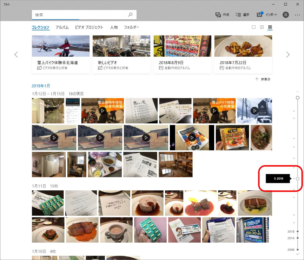 写真は自動的に年月日でまとめられています。右側のメモリ部分を見ると西暦が書かれており、その間に小さな点がありますが、これが「月」になります。