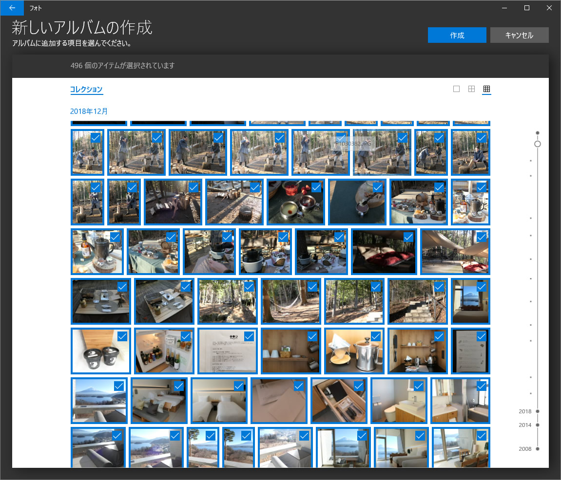 今回は一泊二日でグランピング体験した際の写真をまとめてアルバムを作りたいと思います。写真の選択は、写真1枚ずつ選択する他、日付単位でも可能です。今回は2日間に撮った写真がすべて旅行のものだったので、2日間の写真をそれぞれ一括選択しました。