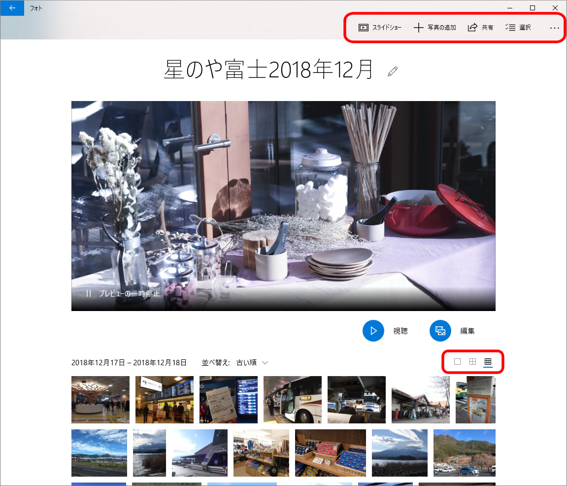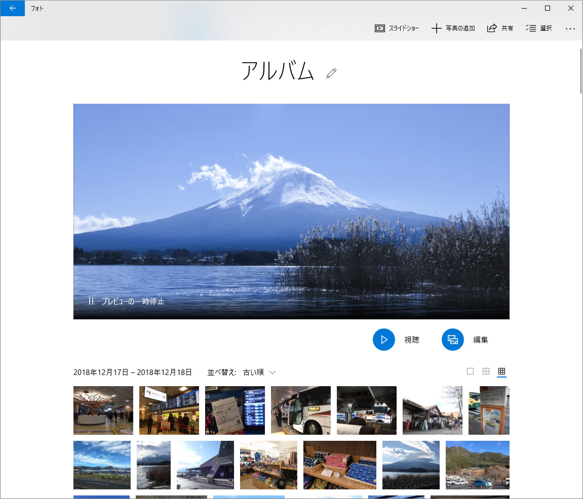 アルバムが完成しました。名前が「アルバム」になってしまっていますので、その右の編集ボタン(鉛筆アイコン)をクリックしてアルバム名を入力してください。最上部では、選択された写真・動画がスライドショー形式のムービーとして表示されています。すぐ下の「視聴」ボタンをクリックすると、BGM入りで再生することができます。