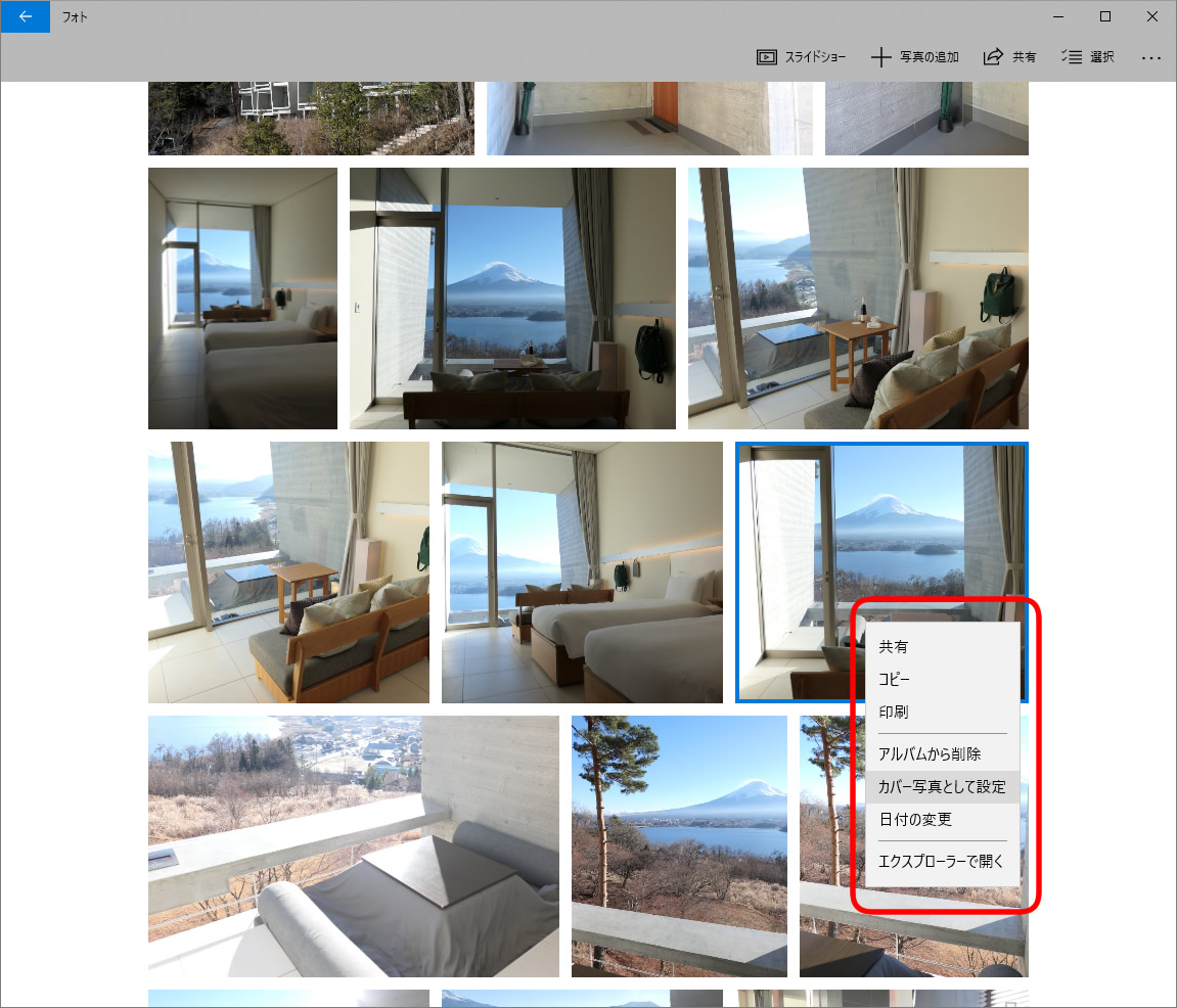 さらに、アルバムの「カバー写真」を設定することができます。これはアルバム一覧の画面で、アルバム名とともに表示されるサムネイル写真です。カバー写真に指定したい写真を右クリックしてメニューを表示させ「カバー写真として設定」を選択してください。