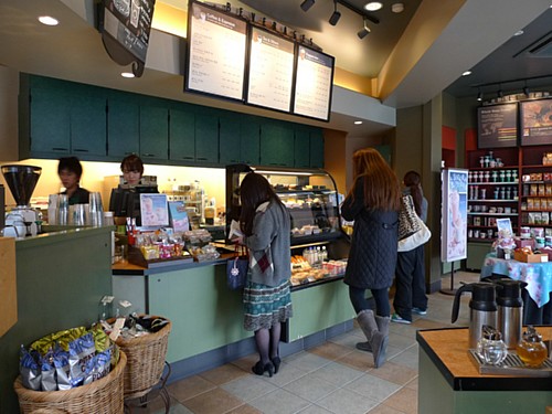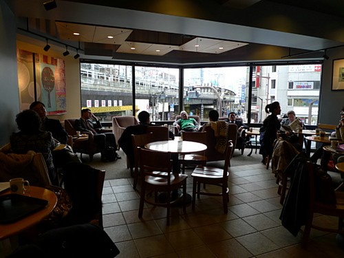 1Fは販売だけで、席はすべて上の階。それほど席数は多くなく、混み合っていることも多い。手前側は2人がけの丸テーブル、中央に大きめのテーブル、奥にソファ席。