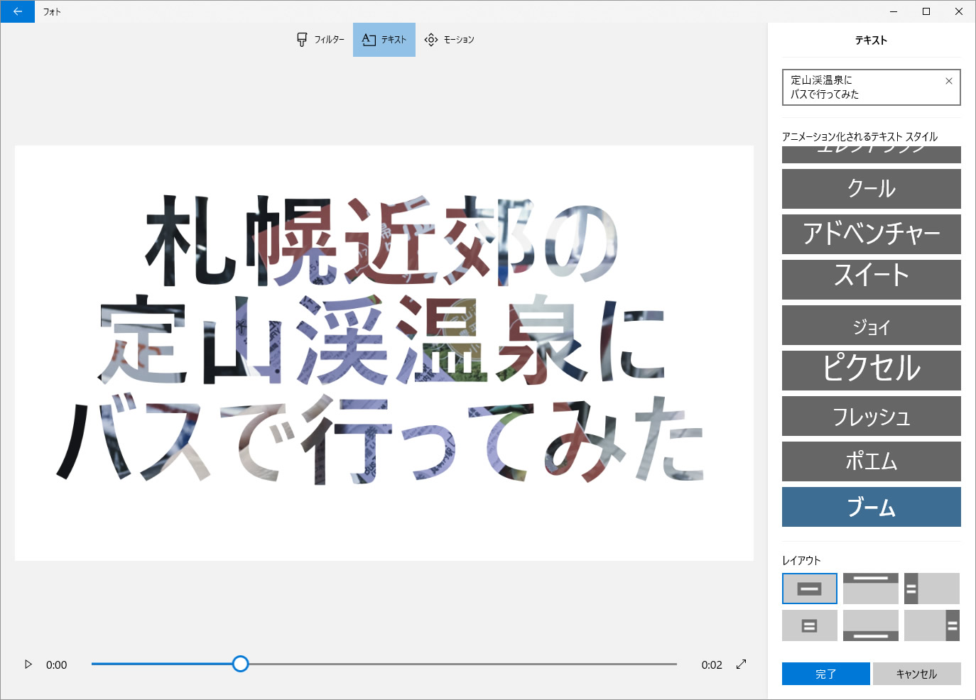 タイトルや字幕的なテキストを挿入することができます。デザインと配置も何種類か用意されているので、その中から好きなものを選ぶだけで簡単です。 「音楽入り自動ビデオ」でお任せ編集動画を作り編集画面へ進む ...