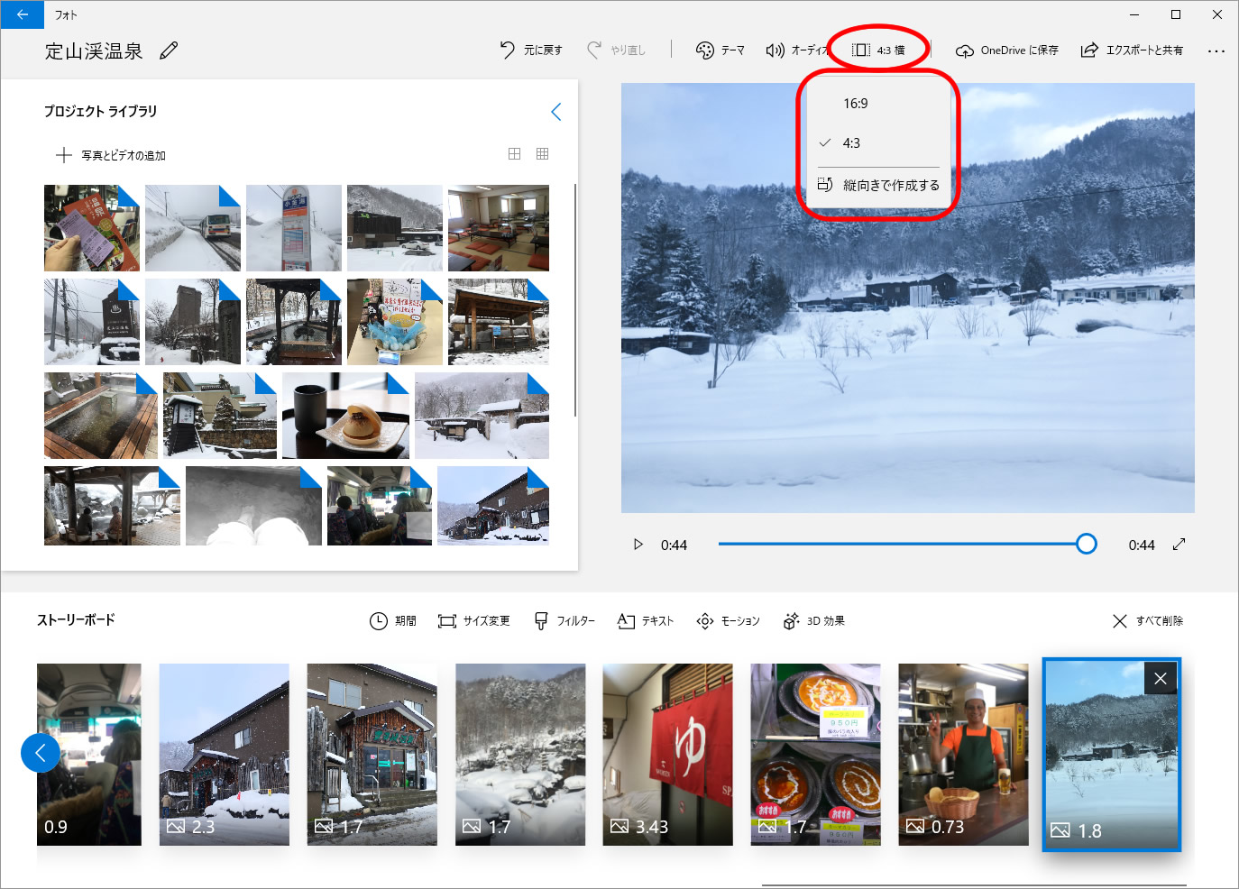 動画は「16:9」もしくは「4:3」の他、縦長でも作ることができます。その際、写真や動画に「16:9」「4:3」と異なるサイズが混在していても大丈夫。各写真・動画毎に「サイズ変更」を行えば、拡大されて ...