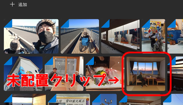 ちなみにプロジェクトライブラリにある動画・写真ファイルのうち、ストーリーボードに並べたものには、左上のところに青い折り返しのような印がつきます。これを見れば、まだ配置していないクリップがどれなのかわかります。